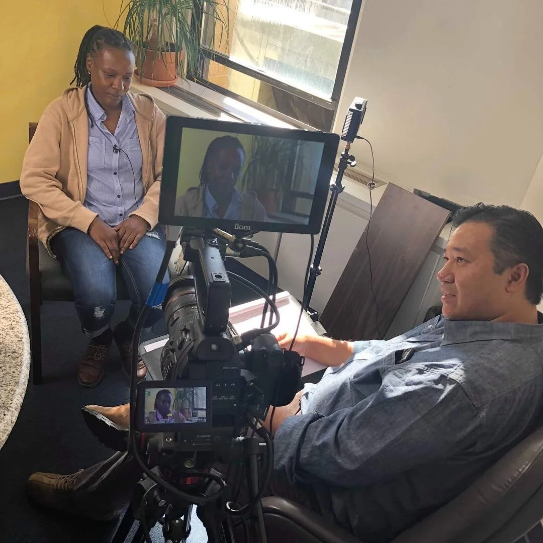 Pictured below (l-r) - Patrice with Marci Hamilton, CEO of CHILD USA, Dave Ohlmuller of A Peloton of One documentary, Connie Altamirano with Gary Greenberg, Patrice being interviewed for A Peloton of One documentary, Patrice with a sponsor from Jades Elevation LLC.